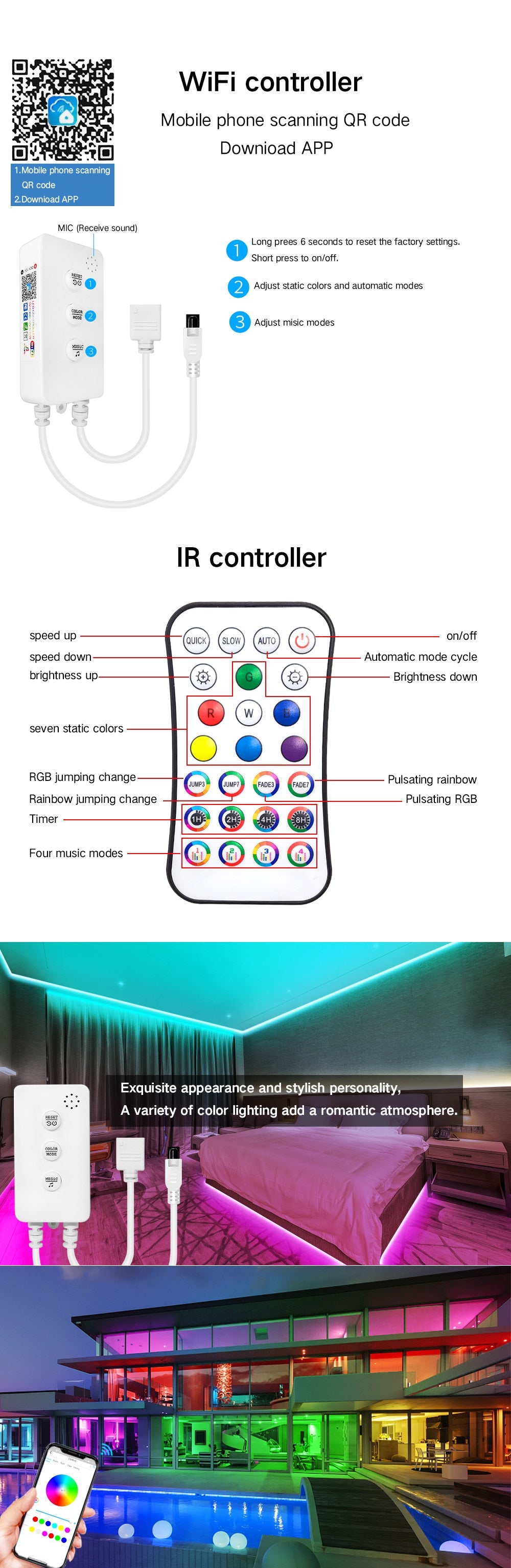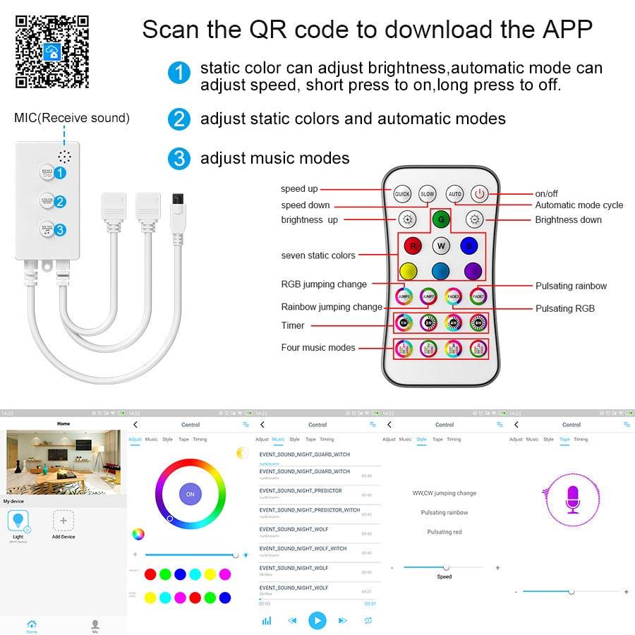 Le ruban LED est contrôlée non seulement par la télécommande, mais également par la technologie connexion sans fil. Compatible avec tous les types de smartphones (Android et iOS). Une application facile à utiliser sur votre smartphone qui peut être utilisée pour modifier les couleurs et les effets d'éclairage.La distance à contrôle atteint 10 metrès.