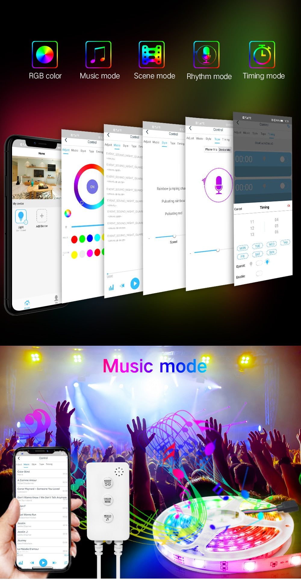 Grace au micro intégré à haute sensibilité, la couleur de la Bluetooth ruban led peut changer suivre le rythme ou la mélodie, selon les différentes musique et le son ambiant. Autres modes de lumière que vous pouvez choisir, comme Flashing, Breathing, Strobe, Gradient, Cool. Vous pouvez aussi DIY votre couleur unique, je pense que cela rendra votre fête plus impressionnante.
